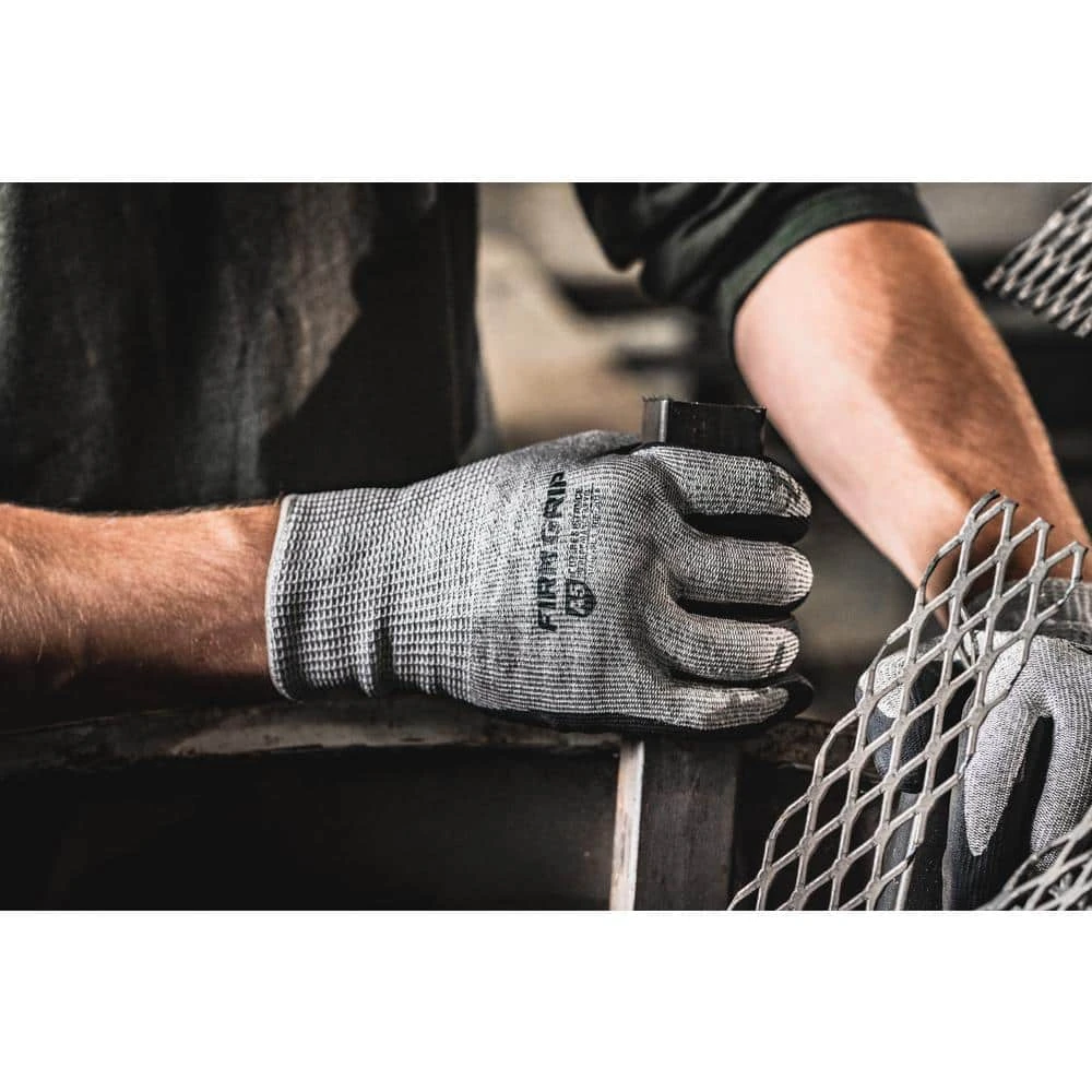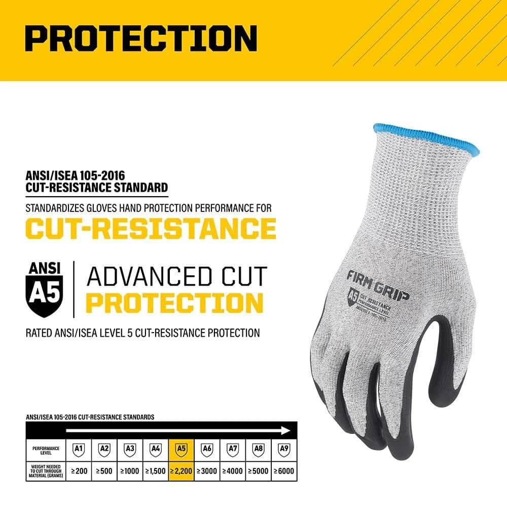 Firm Grip Precision Grip Cut-Resistant work gloves provide industrial grade, ANSI A3 level cut protection, resisting cuts and punctures while maintaining a superior grip in wet or dry conditions. The extremely durable coating protects your palm and fingers with EN388 level 4 abrasion resistance while the comfortable knit shell and cuff keeps out dirt and debris. Ideal for confidently handling everything from large tools to small parts, these are the perfect work gloves to keep in your toolbox, tacklebox, in your shop, or in your car.