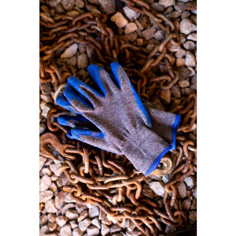 - Glove has a blue, flexible latex palm and finger coating over a durable string knit