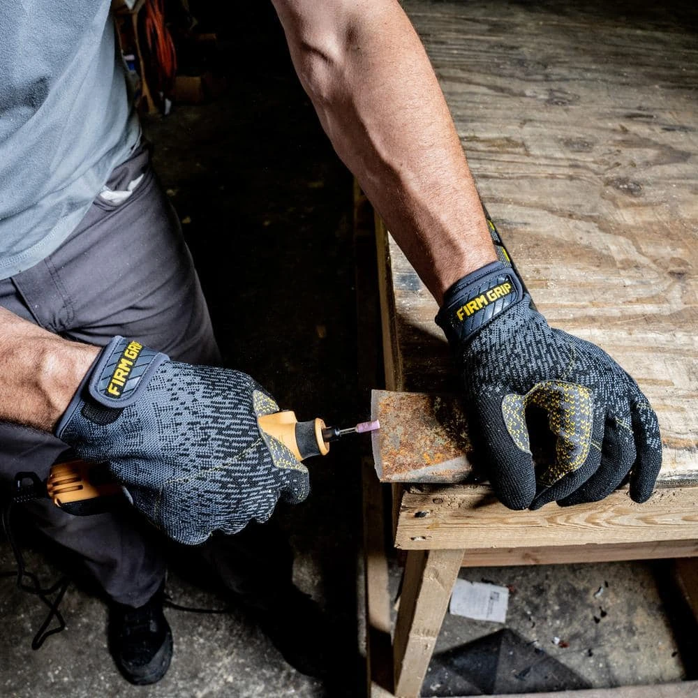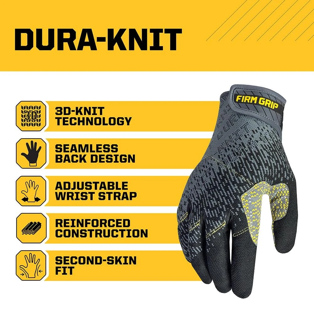 FIRM GRIP’s Dura-Knit work gloves blend the cutting-edge technology of 3D knit construction with durable protection to redefine the Next Generation of Work Gloves. Offering 360° stretch, the breathable Dura-Knit fabric is digitally optimized to mold to the hand for a comfortable second-skin fit and reduce seams along fingers, a common glove failure point. The durable synthetic leather with grip enhanced palm delivers confidence to safely handle everything from large power tools to small parts requiring precision and dexterity. Whether on the jobsite or tackling the latest DIY project, Dura-Knit gloves are built stronger to last longer.