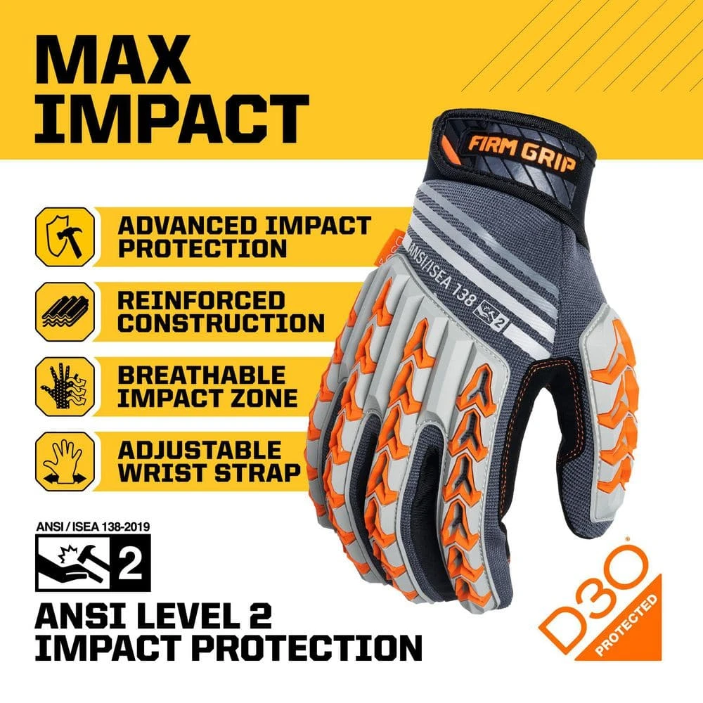 Firm Grip Max Impact work gloves deliver cutting-edge, industrial grade impact protection. Enhanced with D3O technology, the world’s thinnest and most advanced impact absorbing material, these work gloves redefine tough while maintaining outstanding dexterity, movement, and comfort. Ideal for heavy duty construction and demolition, Max Impact provides an ANSI/ISEA 138 level 2 impact rating to keep your hands protected on the job.