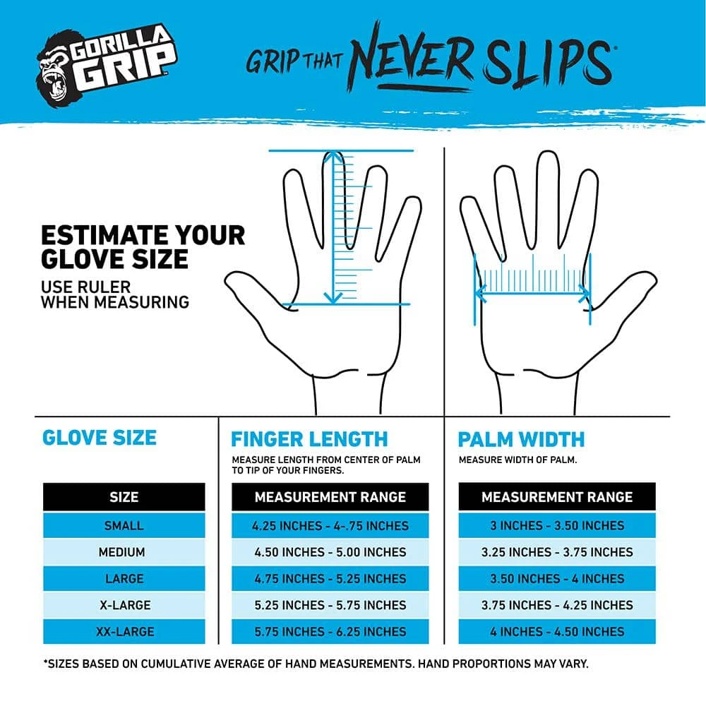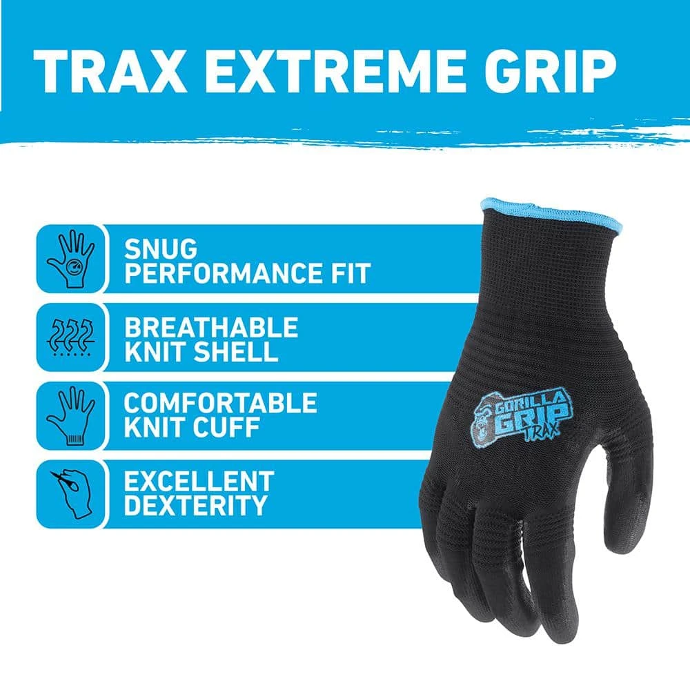 Combining the unrivaled performance of GORILLA GRIP Never Slip Technology with a rugged, textured design that channels dirt and grime away from surface contact areas, GORILLA GRIP TRAX work gloves deliver maximum gripping power in the most extreme conditions. Proprietary polymer technology on the palm pulls moisture away from the surface and the heavy-duty, ribbed design pushes dirt and grit into the valleys for maximum contact and grip in wet, dry, or oily applications. Light-\weight and breathable, they provide excellent dexterity and a snug, performance fit.
