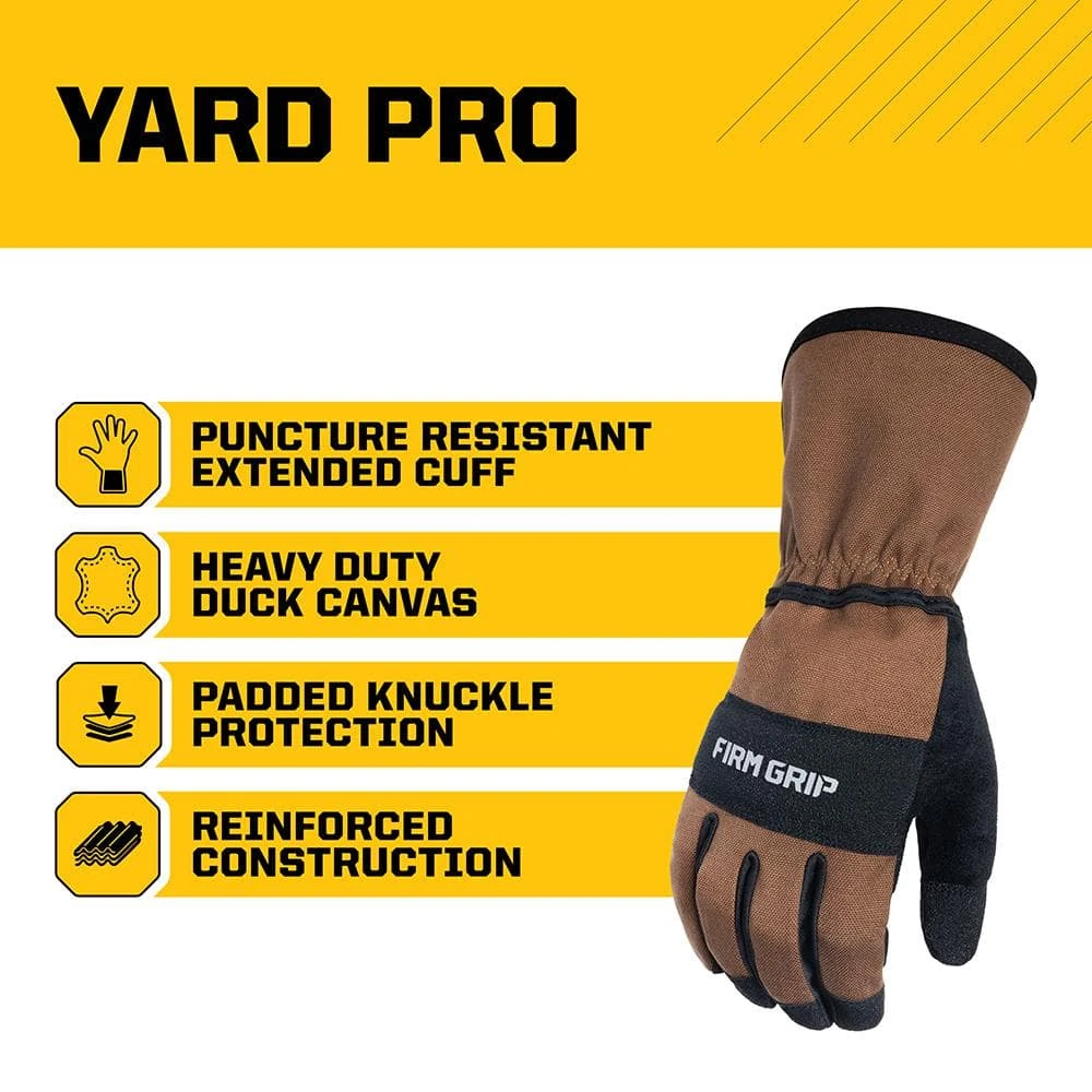 Designed specifically for landscaping, planting, and other outdoor work, Firm Grip Yard Pro work gloves feature puncture-resistant, extended cuffs that protect the wrists and forearms. The heavy-duty duck canvas is abrasion-resistant and dries quickly after working in wet conditions without becoming stiff. Additional abrasion reinforcements on the palm, fingers, and knuckles make these long-lasting work gloves an ideal choice for a wide variety of outdoor projects.