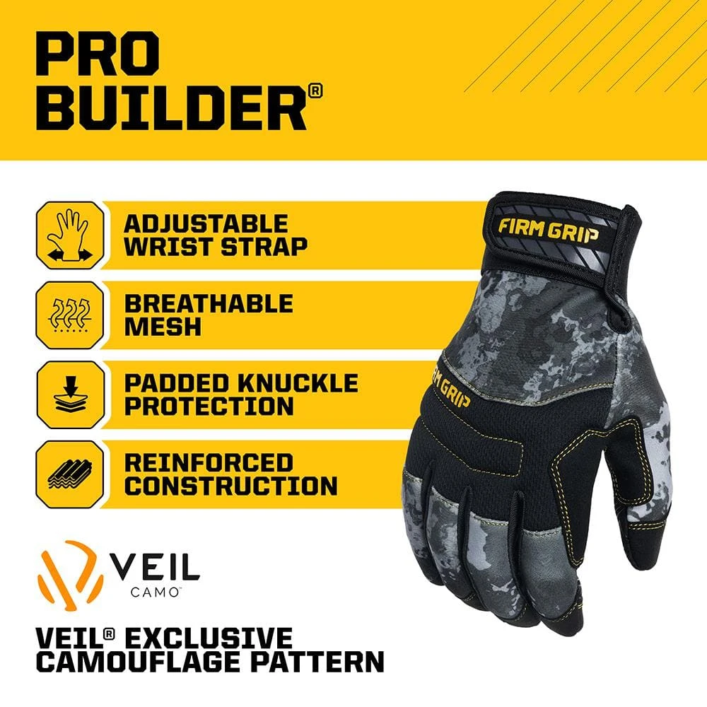 The Firm Grip Pro Builder delivers a high-performance design that combines form, function, and fit for a wide variety of projects. Providing padded knuckle protection, these versatile work gloves are reinforced in all the right areas, and the lightweight, breathable construction is extremely comfortable for all-day use. The grip-enhanced palm lets you confidently handle everything from large power tools to small parts requiring precision and dexterity, while the exclusive VEIL camo pattern means you’ll look good doing it.