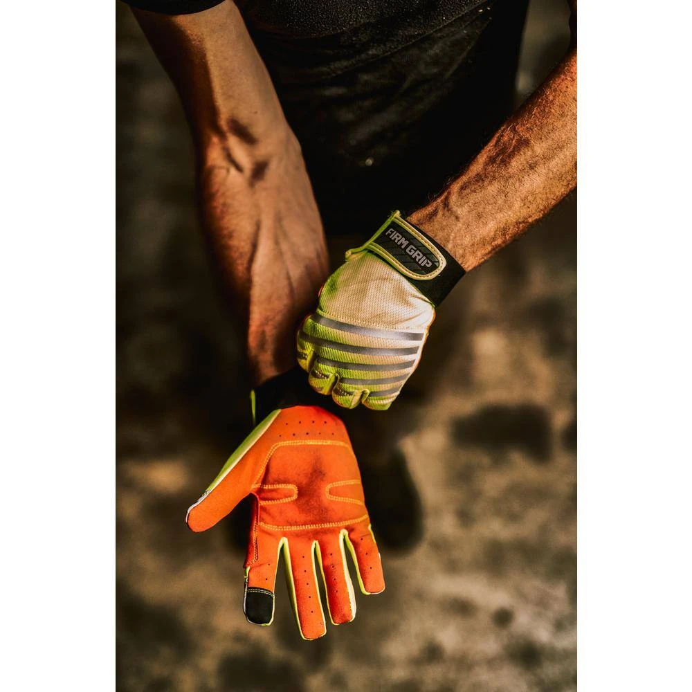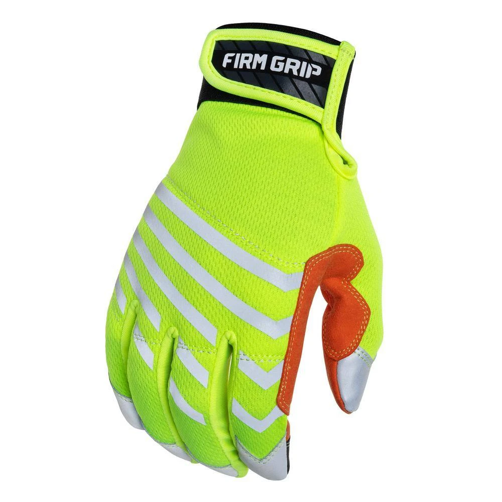 Specifically designed to enhance visibility and safety on the job, Firm Grip Safety Pro work gloves feature industry standard, hi-vis colors with reflective panels for low-light environments. These high-performance work gloves are reinforced to protect your hands while providing an extremely comfortable fit for all-day use. The durable, synthetic leather palm provides an excellent grip while the stretch panels between the fingers breathe for enhanced comfort and improved dexterity.