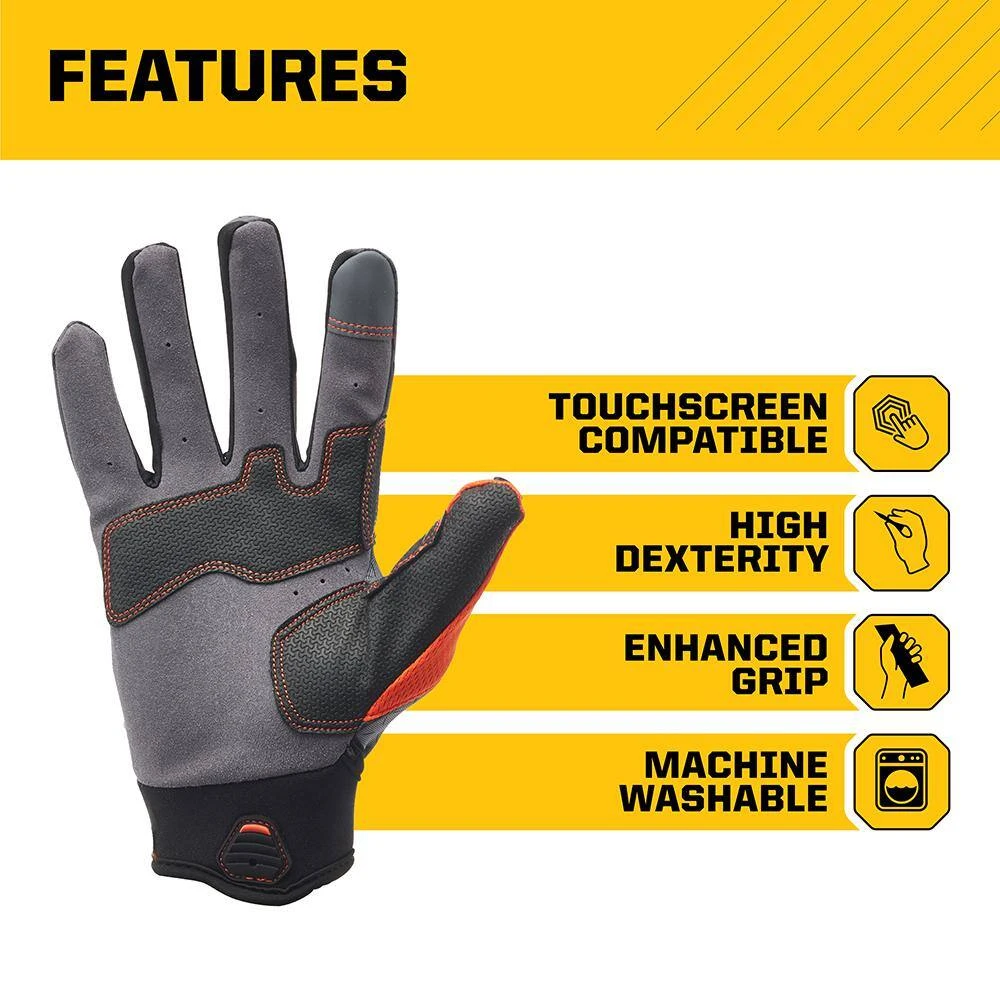 Flex Impact gloves deliver increased flexibility and breathability, while delivering full back-of-hand impact protection. The snug, athletic fit conforms to your hand to help reduce fatigue. Grip and protection are enhanced by an additional layer of synthetic leather spanning the palm and thumb. A durable and adjustable hook and loop strap provides a customized fit and touchscreen compatible technology offers easy access to electronic devices without having to remove your gloves. Machine washable for a longer life.