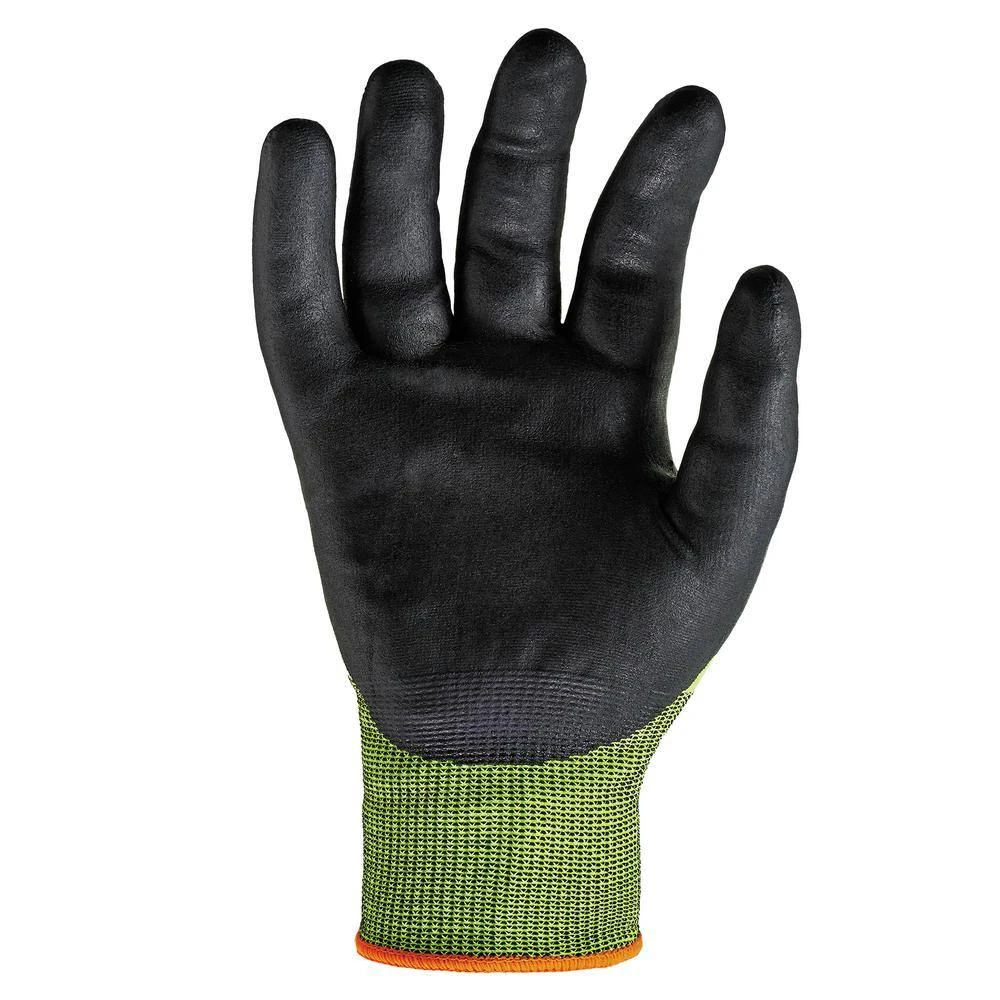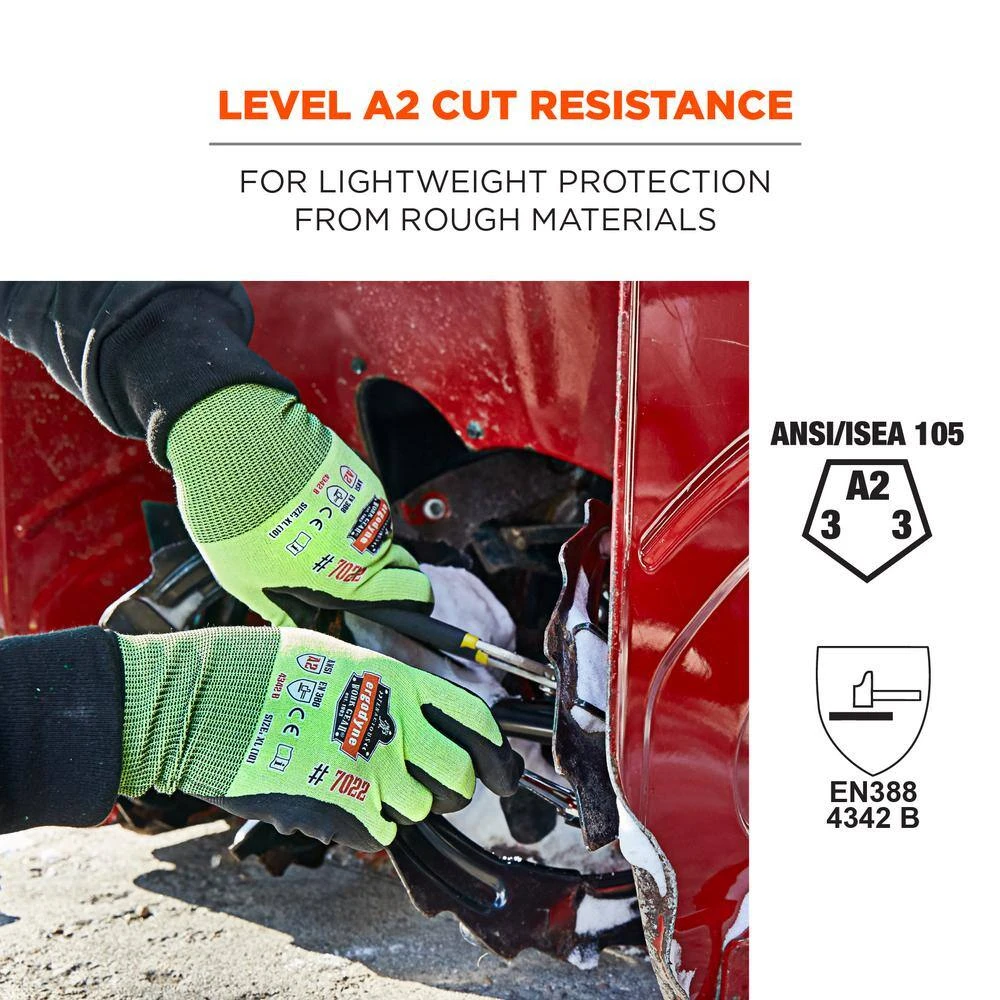 The ProFlex 7022 Nitrile Coated Gloves feature a durable DSX coating for optimal grip and dexterity in dry conditions, plus ANSI/ISEA 105-2016 A4 cut protection for safety around sharp materials. Unlike other bulky cut-resistant gloves, the 18-gauge HPPE nylon-spandex knit protects hands while maintaining a soft, lightweight and flexible form fit. The snug knit cuffs are longer than most on the market, a feature that enhances fit and extends protection while keeping dirt and debris out. DSX COATED PALMS FOR GRIP IN DRY CONDITIONS Coated in two-layer DSX nitrile, a.k.a. (D)ry (S)urface E(X)treme, these safety gloves are designed for optimal performance when handling dry materials and surfaces. The double layers of smooth abrasion-resistant nitrile boosts glove durability and feel while remaining comfortably flexible for maximum dexterity and minimum hand fatigue. ANSI/ISEA 105-2016 A2 CUT RESISTANCE and LEVEL 3 ABRASION RESISTANCE // 18-GAUGE KNIT.