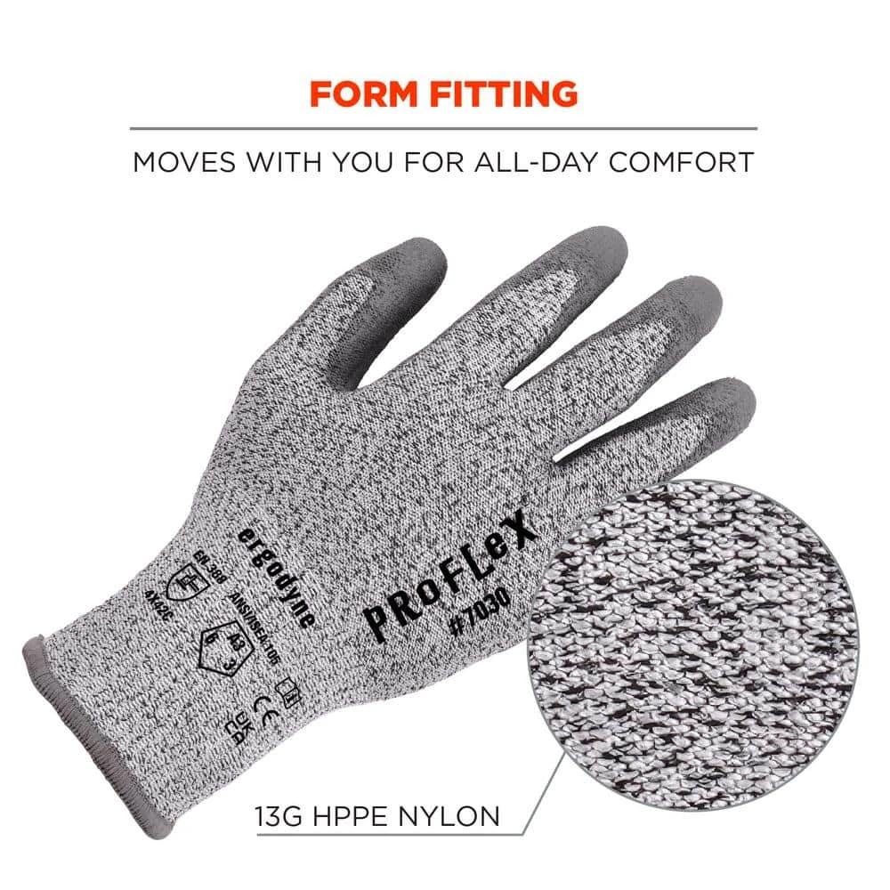 The ProFlex 7030 PU Coated Cut-Resistant Gloves feature PU coated palms for excellent grip and dexterity, plus ANSI/ISEA 105-2016 level A3 cut protection for safety around sharp materials. The form-fitting 13-Gauge HPPE nylon-spandex knit protects from cuts and knicks without compromising flexibility or comfort. The snug knit cuffs are longer than most on the market, a feature that enhances fit and extends protection while keeping dirt and debris out. PU COATED PALMS FOR ALL-PURPOSE GRIP The palms of these safety gloves are dipped in PU (polyurethane), a strong but flexible coating that delivers secure grip with enhanced dexterity on a variety of surfaces. ANSI/ISEA 105-2016 LEVEL A3 CUT RESISTANCE LEVEL 6 ABRASION RESISTANCE // 13-Gauge KNIT The 13-Gauge seamless HPPE nylon-spandex knit is tested to ANSI/ISEA 105-2016 level A3 cut protection and level 6 abrasion resistance for safety around sharp or rough materials.