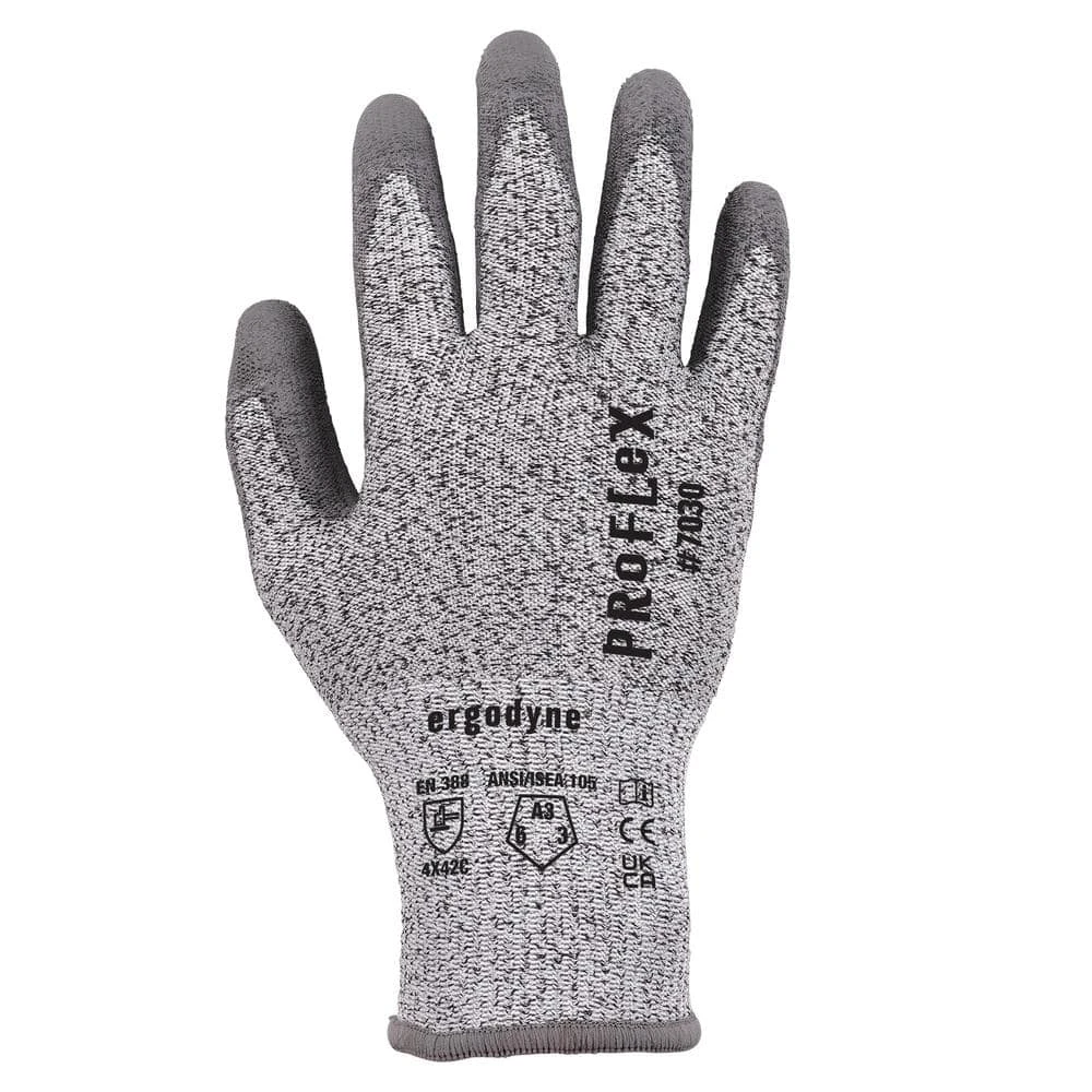 The ProFlex 7030-PU Coated Cut-Resistant Gloves feature PU coated palms for excellent grip and dexterity, plus ANSI/ISEA 105-2016 level A3 cut protection for safety around sharp materials. The form-fitting 13-Gauge HPPE nylon-spandex knit protects from cuts and knicks without compromising flexibility or comfort. The snug knit cuffs are longer than most on the market, a feature that enhances fit and extends protection while keeping dirt and debris out. PU COATED PALMS FOR ALL-PURPOSE GRIP The palms of these safety gloves are dipped in PU (polyurethane), a strong but flexible coating that delivers secure grip with enhanced dexterity on a variety of surfaces. ANSI/ISEA 105-2016 LEVEL A3 CUT RESISTANCE LEVEL 6-ABRASION RESISTANCE // 13-Gauge KNIT The 13-Gauge seamless HPPE nylon-spandex knit is tested to ANSI/ISEA 105-2016 level A3 cut protection and level 6-abrasion resistance for safety around sharp or rough materials.