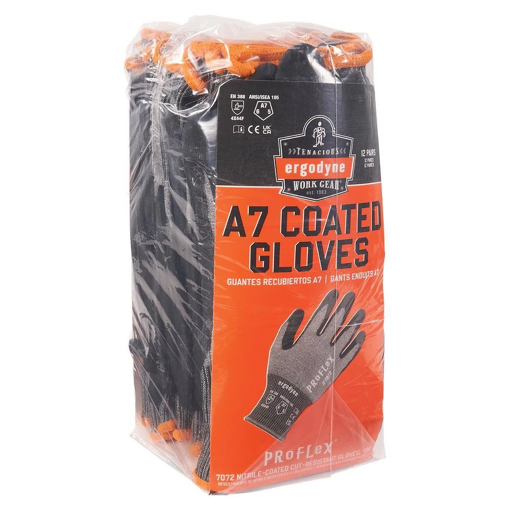 The Pro Flex 7072 Nitrile Coated Cut-Resistant Gloves feature industry-leading ASX coated palms for superior gripping on wet, oily or dry surfaces. Also unique to this glove is the combination of incredibly high ANSI/ISEA 105-2016 level A7 cut resistance with a lightweight and flexible 18-Gauge tungsten knit for no-bulk, form-fitting comfort. The snug knit cuffs are longer than most on the market, a feature that enhances fit and extends protection while keeping dirt and debris out. Coated in ASX nitrile, AKA (A)ll Surface Extreme, these safety work gloves are among the best in the industry for material handling on all surfaces. With a 20% better grip performance than sandy nitrile, ASX outperforms all other dips on wet, oily and dry surfaces. The multi-layer coating boosts glove strength without compromising fit or feel, allowing for enhanced dexterity and minimal hand fatigue. ASX nitrile is tested to the highest possible abrasion resistance (level 6), putting it among the most durable coatings on the market. The 18-Gauge seamless HPPE tungsten knit is tested to ANSI/ISEA 105-2016 level A7 cut protection and the highest possible ANSI/ISEA 105-2016 level 6 abrasion resistance for safety and durability around the sharpest and roughest materials. These nitriles coated utility gloves are ideal for those regularly handling sharp materials in industries such as manufacturing, food prep, meat processing, automotive, construction and more.