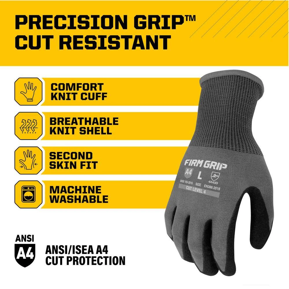 Delivering a second skin fit and best-in-class grip in wet, dry, and the messiest of conditions, Firm Grip’s Precision Grip work gloves are the obvious choice when unmatched comfort, dexterity, and a precise feel are required. The extremely durable coating protects your palm and fingers with ANSI level 4-abrasion resistance while the comfortable knit shell and cuff keeps out dirt and debris. Ideal for confidently handling everything from large tools to small parts, Precision Grip work gloves are a must have when dealing with grease, grime, and oil.