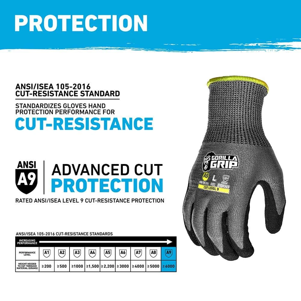 Gorilla Grip Precision Grip Cut-Resistant work gloves provide serious industrial grade, ANSI A9 level cut protection, resisting cuts and punctures while maintaining a superior grip in wet or dry conditions. The extremely durable coating protects your palm and fingers with EN388 level 4 abrasion resistance while the comfortable knit shell and cuff keeps out dirt and debris. Ideal for confidently handling everything from large tools to small parts, or working with sharp blades, rough metal, or glass, these are the perfect work gloves to keep in your toolbox, tacklebox, in your shop, or in your car.