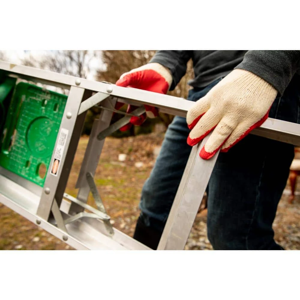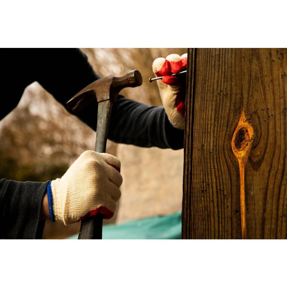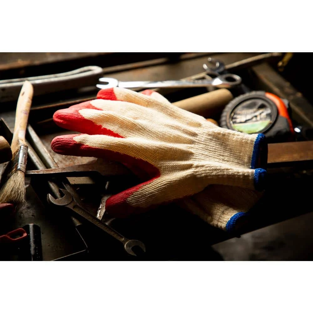 - Glove has a red, flexible latex palm and finger coating over a durable string knit