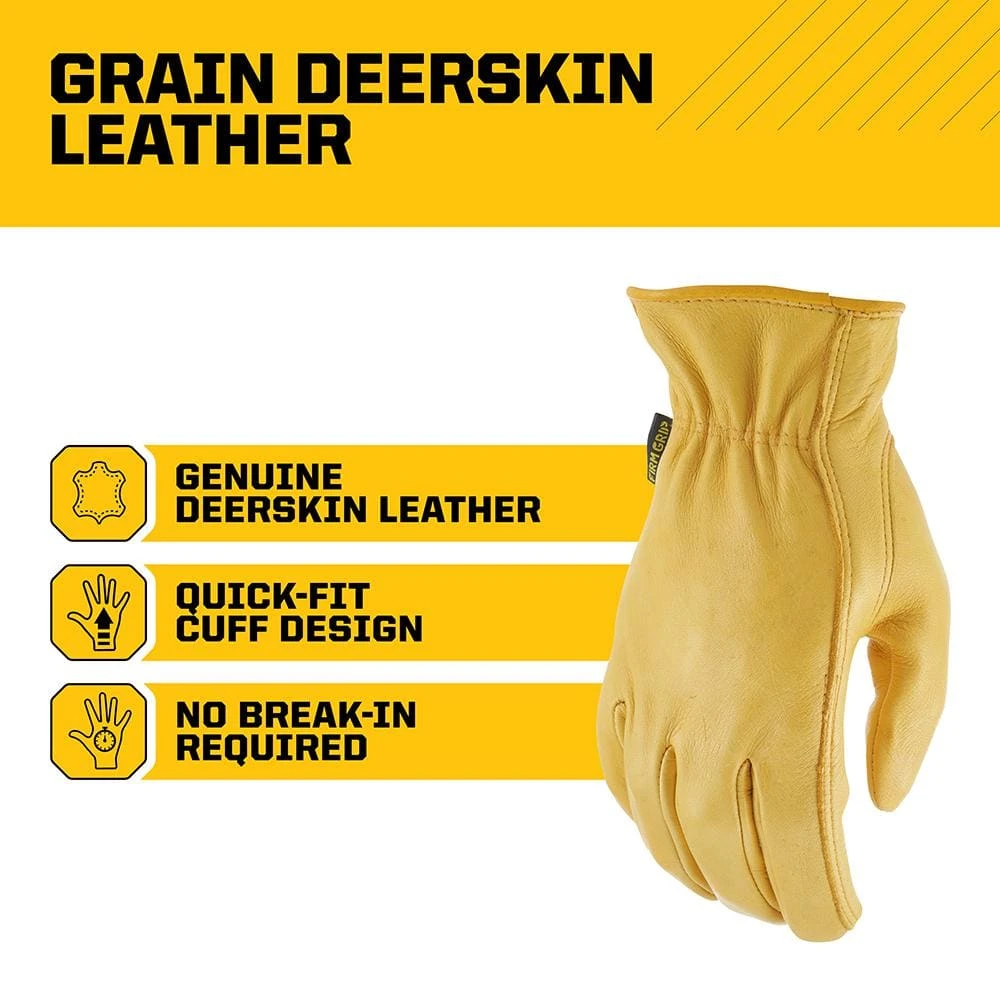 Forget the standard break-in period for new leather gloves. The Firm Grip Full Grain Deerskin Leather gloves are soft and supple and conform to your hand from the first time you pull them on. They keep you protected in the yard or the shop and go on and off easily with the intuitive quick-fit cuff.